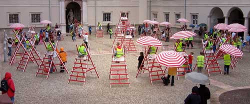 Auf hohem Ross - Camera externa Realisierung Zum Auftakt der Architekturtage 2006 realisierte Otto Beck mit Schülerinnen und Schülern des Akademischen Gymnasiums, vorwiegend aus der Unterstufe, am Mittwoch 7. Juni, l7.00 Uhr im Hof Dietrichsruh , Toskanatrakt der Residenz das Konzept als „Liturgie vom Bauen“ Das Projekt versucht die Antriebe zum Bauen, die archetypischen Gefühle zum Bauen, also quasi Arc he-tektur vor der Architktur zu thematisieren. Wo, wie nehmen wir Platz zum Bauen? Warum ist das Einfamilienhaus der Traum so vieler Paare? Warum trifft man in den Baumärkten auf soviel Tatendrang? Warum brauchen wir in unserer Mitte schlussendlich immer Tempel? Und-ganz wichtig- wie kann man über Architektur sprechen? Die 30 Bockleitern wurden von den SchülerInnen und Schüler in einem sechswöchigen Kraftakt im Herbst 2005 gebaut. Liedeinstudierung Christa Berger und Beate Hemetsberger. Vorgesehener Ablauf der ca. 40 Minuten: