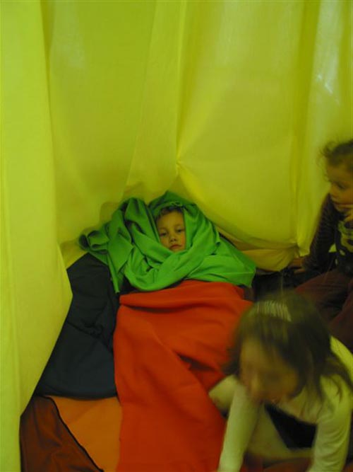 Eine Woche lang agierte eine Kindergruppe jeden Vormittag unter spielerischer Anleitung der Architektin mit Stoffen, Papier, Farben und Lichtern, um spezielle Raum- und Lichtsituationen zu kreieren.